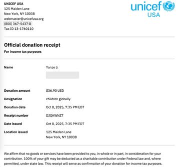 Since January 2023, we have made monthly donations to UNICEF USA—an ongoing act of compassion that continues unbroken to this day.