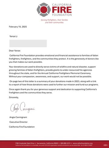 Since the very first donation in January 2023, our monthly contributions to the California Fire Foundation have never stopped—each month a quiet salute to those who serve with courage and heart.