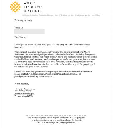 Monthly Donations to the World Resources Institute (WRI)